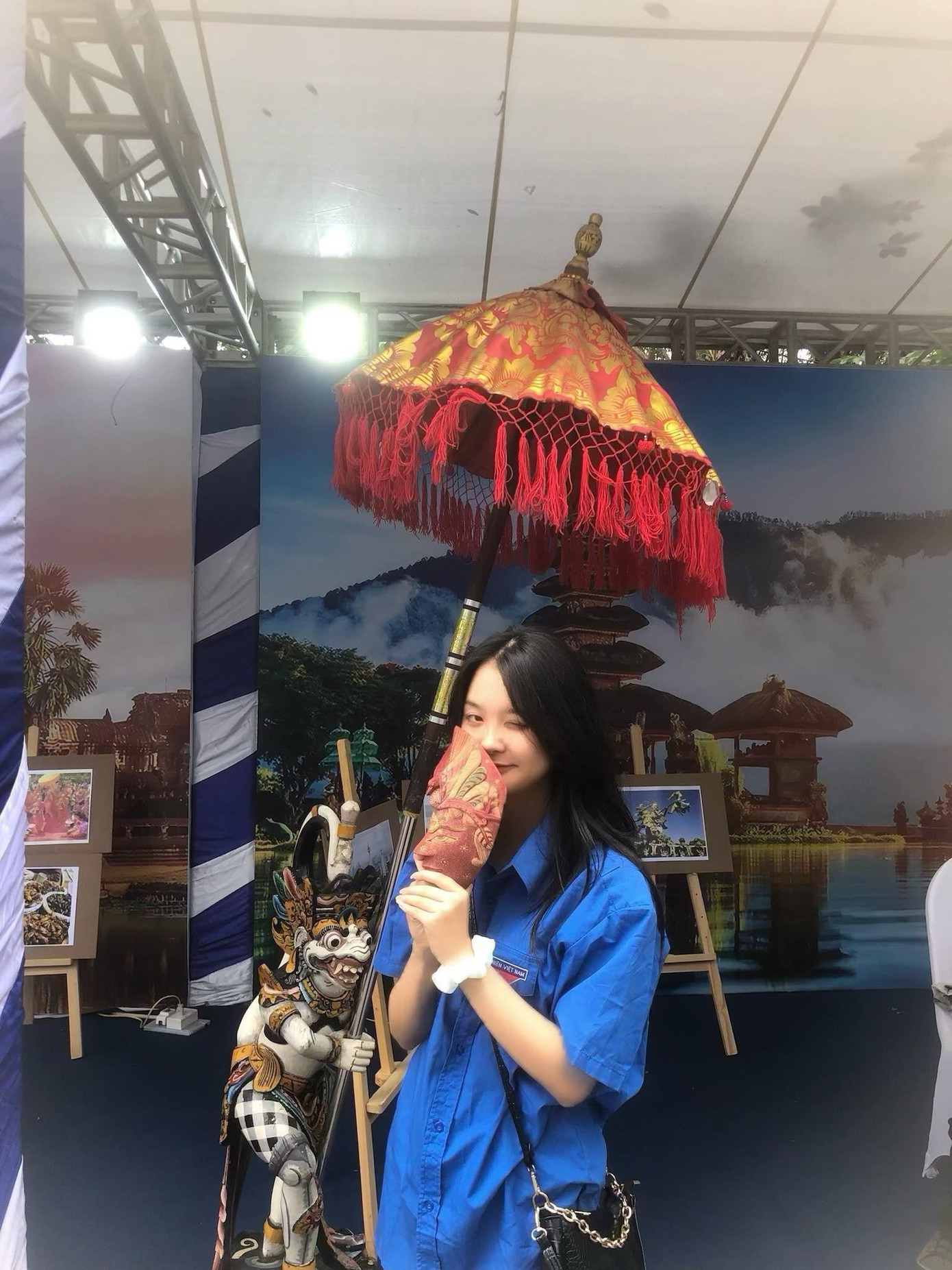 Trong trang phục áo dài truyền thống, Nguyễn Đình Vinh Khánh (2001) - sinh viên trường Đại học Mở Hà Nội đảm nhiệm vai trò là một hướng dẫn viên cho Thành đoàn Hà Nội tại gian hàng của Việt Nam.