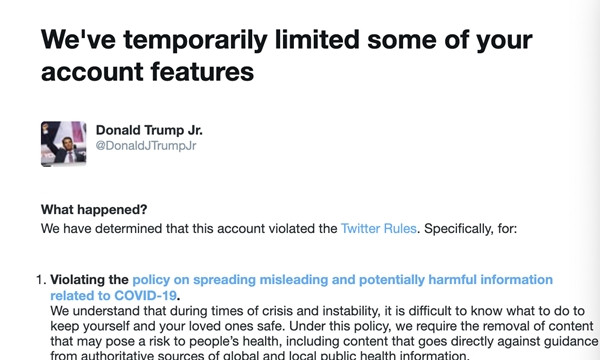 Trên Twitter, thường thì người vi phạm lần đầu sẽ bị chặn, không được dùng tài khoản của mình nữa, cho đến khi chịu xóa bài đăng. Lần vi phạm thứ hai sẽ khiến tài khoản của người sử dụng tạm bị “đóng băng”. Thực tế, Donald Trump Jr., con trai lớn của Tổng thống Trump, từng bị cấm sử dụng Twitter trong 12 tiếng sau khi viết thông tin sai về COVID-19 và thuốc hydroxychloroquine vào hồi tháng 7.