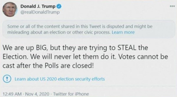 Từ trước khi chiến thắng trong cuộc bầu cử 2016, thì ông Trump đã quen tận dụng Twitter làm “cái loa” của mình. Kể từ khi dùng Twitter vào năm 2009, ông đã tweet hơn 58.000 lần. Sau Ngày Bầu Cử năm 2020, Tổng thống Trump làm “ngập” Twitter với nhiều bài đăng liên tiếp về gian lận bầu cử (không có bằng chứng) và tuyên bố rằng mình thắng (ngược với các nguồn tin). Chỉ trong 2 ngày sau Ngày Bầu Cử, Twitter phải gắn cảnh cáo vào 50% số tweet của Tổng thống Trump. Kể từ đó đến nay, Twitter cũng phải gắn cảnh cáo vào hầu hết các bài đăng của ông để làm giảm khả năng lan truyền những thông tin không có cơ sở mà ông đã viết.
