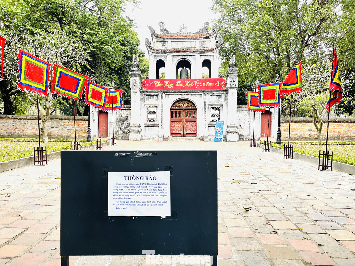 Tại Văn Miếu Quốc Tử Giám, biển thông báo tạm đóng cửa dừng hoạt động được dán ngay trước cổng.