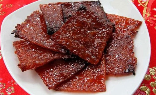 Món thịt khô Bak Kwa dùng để ăn chơi rất phổ biến tại Singapore và cũng được xem là ẩm thực truyền thống trong ngày Tết. Món ăn vặt này mang màu đỏ và được gói bằng loại giấy cũng màu đỏ để biểu trưng cho sự may mắn.