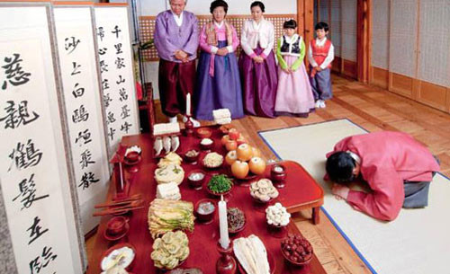 Người Hàn Quốc cũng đón Tết dương lịch và Tết âm lịch cổ truyền (Seollal) như ở Việt Nam. Tết truyền thống Hàn thường kéo dài trong 3 ngày: Ngày 30 Tết, mùng 1 và mùng 2 Tết. Trong những ngày này, mọi người mặc những bộ hanbok (trang phục truyền thống), hành lễ trước tổ tiên, người lớn tuổi trong gia đình. Mọi người thường tụ tập ở nhà người trưởng nam, chuẩn bị sẵn một chiếc bàn thấp, trên đó đặt tờ sớ và nhiều món ăn theo nghi lễ.