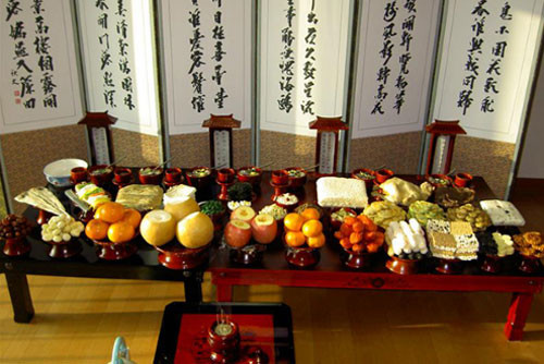 Mâm cỗ cúng đêm giao thừa của người Hàn Quốc thường có tới hơn 20 món, trong đó không thể thiếu món canh bánh gạo (tteokguk) và món cay kim chi. Ngoài ra còn có các món khác như cá khô, thịt bò khô, bánh bao hấp, hoa quả, rau, hồng khô và các loại bánh cổ truyền.