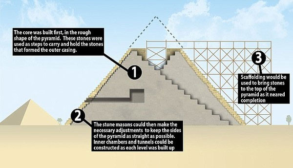 Theo ông, thực chất họ đã xây từ trong ra ngoài. Cụ thể hơn, người Ai cập dựng phần lõi bên trong bằng những tảng đá nhỏ và nhẹ hơn, sau đó bao bọc bên ngoài bằng các tảng đá to được di chuyển nhờ giàn giáo.