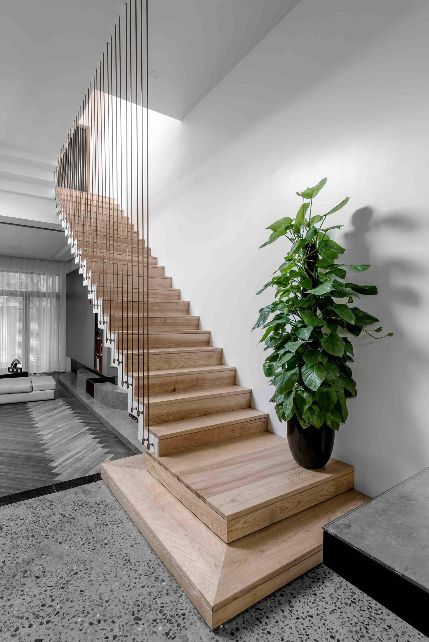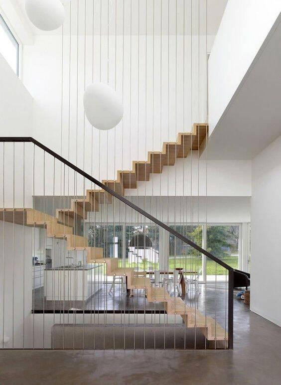 | Mẫu cầu thang thiết kế sử dụng khung sắt, bậc gỗ và dây văng thép đem đến sự tiện nghi và sang trọng. |