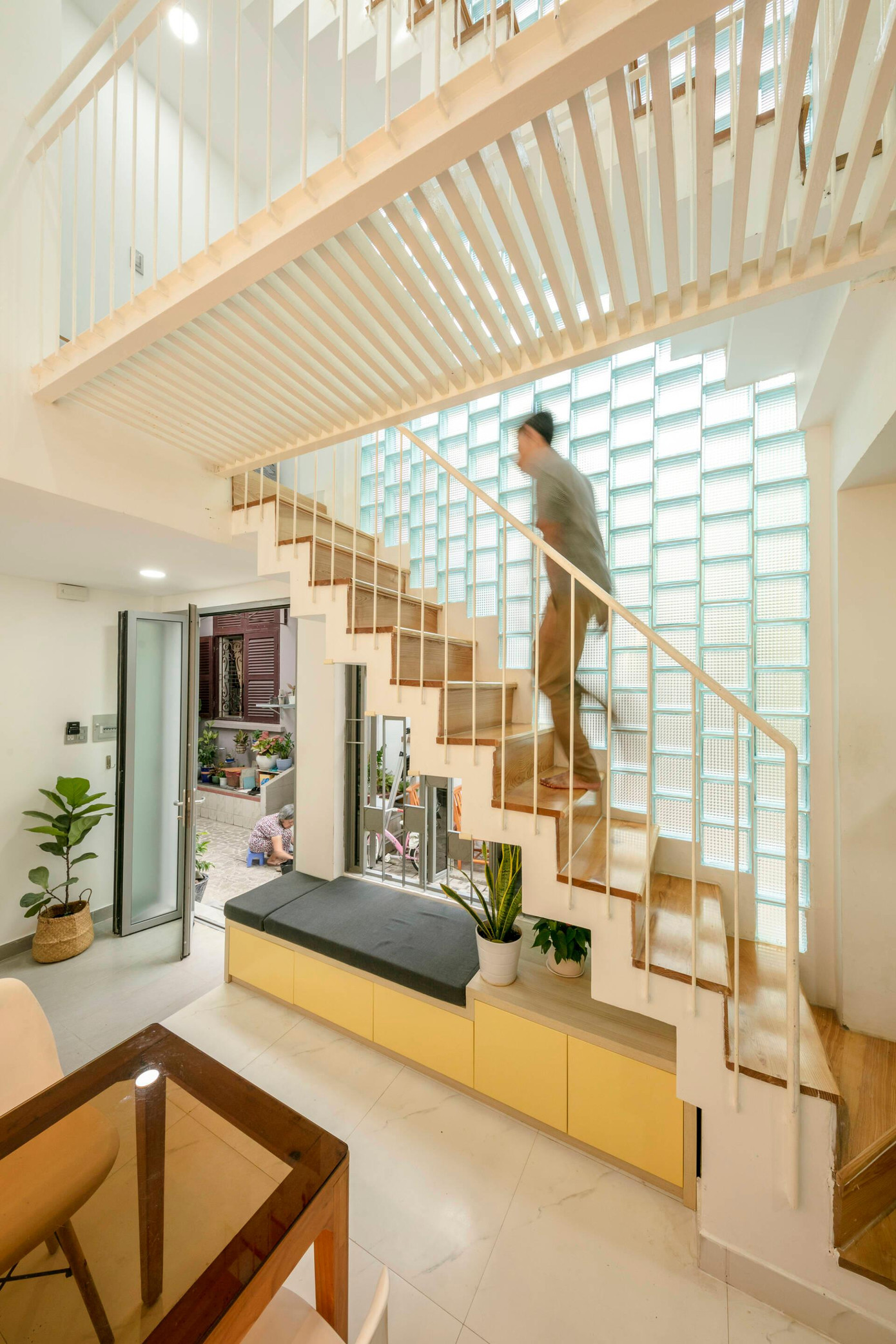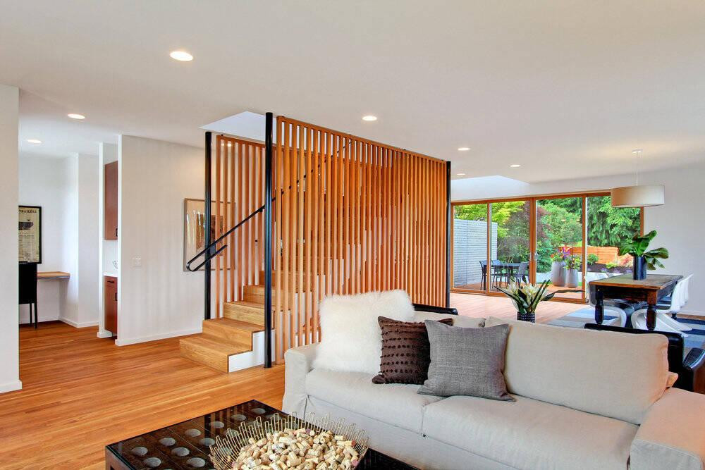 | Mẫu cầu thang bậc gỗ, vách ngăn kính, tay vịn bằng gỗ đang được nhiều gia đình săn đón vì giúp không gian nhà luôn sáng, thoáng. |