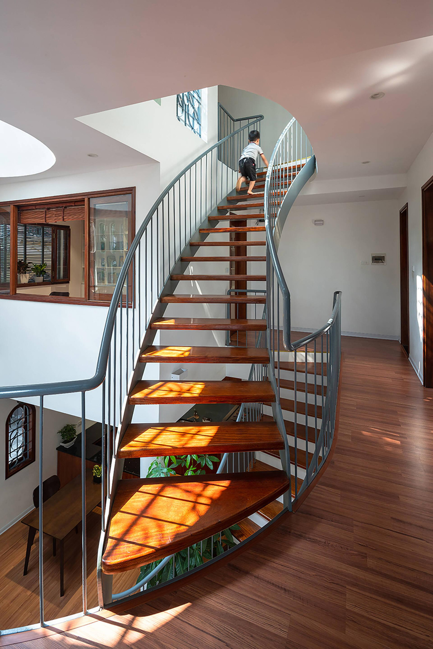 | Cầu thang gỗ dùng song sắt thay con tiện làm vách ngăn. |