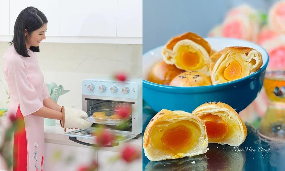 Không chỉ trổ tài với kiểu bánh nướng truyền thống mà Ngọc Hân còn mày mò làm bánh Trung Thu ngàn lớp nhân đậu xanh trứng muối. Nhìn thành quả mà Ngọc Hân chia sẻ thì mẻ bánh của nàng hậu cực kỳ chuẩn chỉnh, lớp nhân giòn rụm bên ngoài bao quanh nhân mềm mịn bên trong. Và nàng hậu rất thích làm thật nhiều bánh nướng để mang tặng người thân, bạn bè.