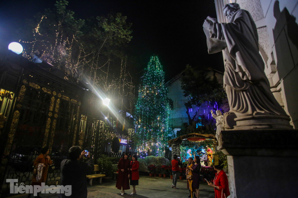 Cây thông cao chừng 4m lấp lánh tại một góc nhà thờ, cạnh hang đá.