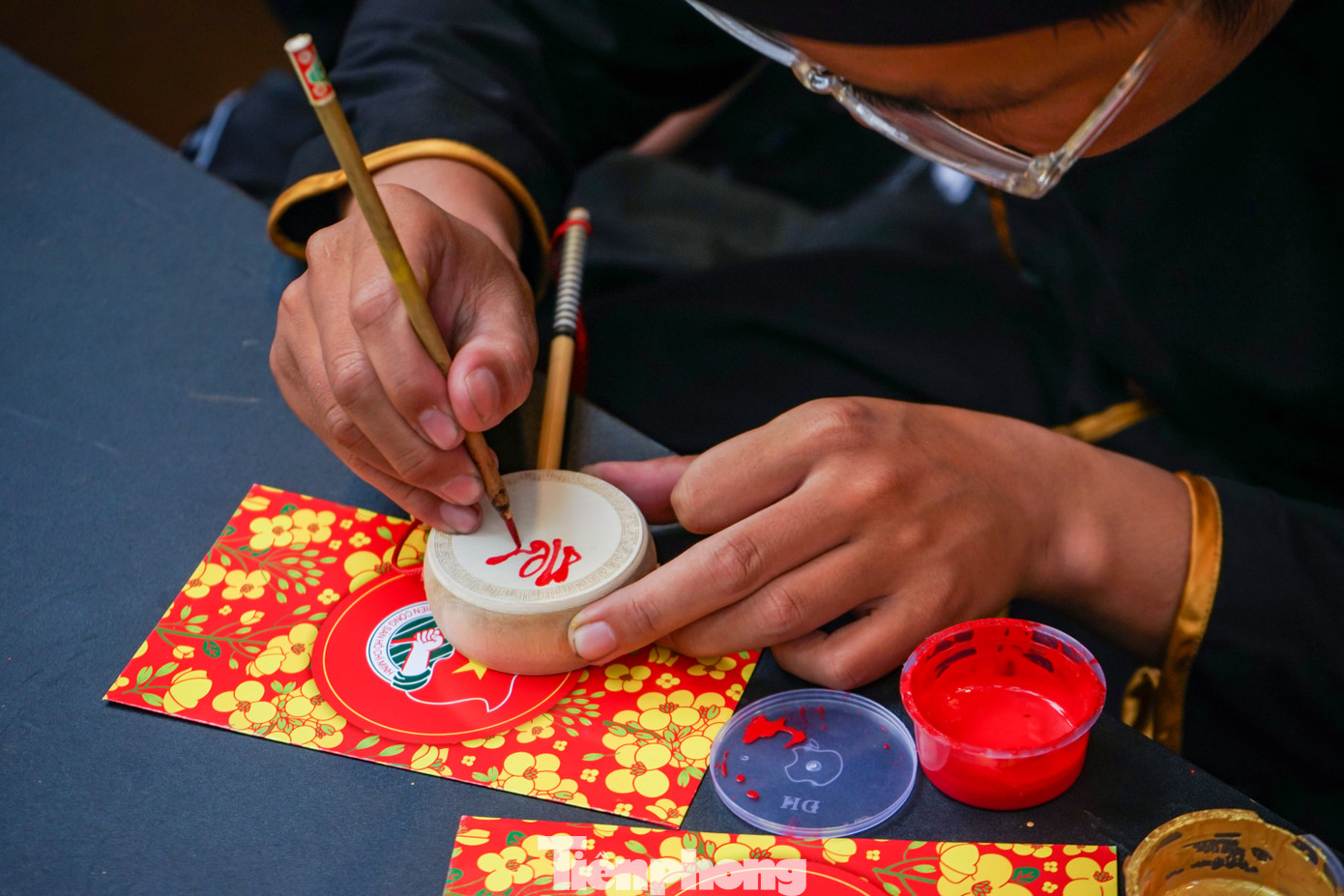 | Ông đồ Hoàng Việt trổ tài vẽ tranh linh vật con mèo trang trí bao lì xì cho khách du lịch |
