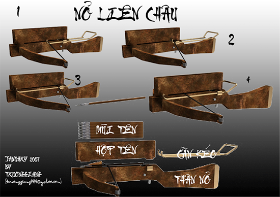 Năm 1964 các nhà khảo cổ học đã khai quật được ở xã Thái Bình gần Thành Đô máy nỏ bằng đồng ghi lại được làm vào ngày 30 tháng 2 năm Cảnh Diệu thứ 4 thời hậu chủ Lưu Thiện (tức 27 năm sau ngày Gia Cát Lượng mất). Nỏ này là loại nỏ mà Gia Cát Lượng đã cải tiến.