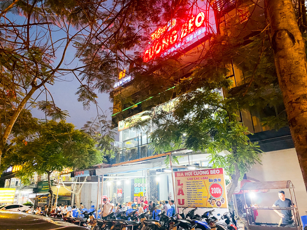 Quán bia trên phố Nguyễn Phong Sắc, hàng dài xe ô tô đỗ chật kín trước cửa quán.