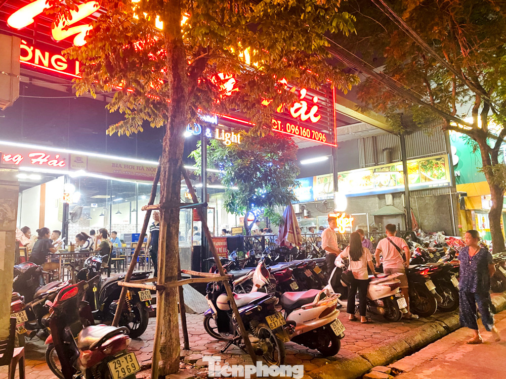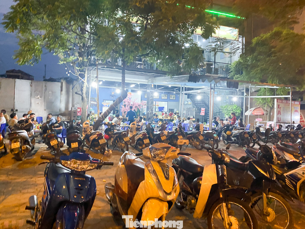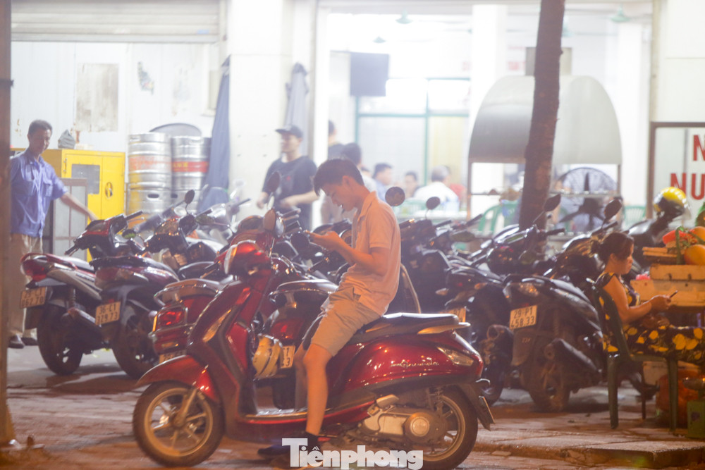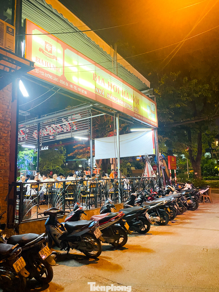 Tại quán bia trên đường Láng, vỉa hè xe máy đã xếp kín không còn chỗ trống, người dân phải đi bộ xuống dưới lòng đường rất nguy hiểm.