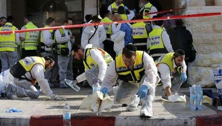 Sáng 18/11, hai người Palestine được trang bị dao và súng đã tấn công một giáo đường tại thánh địa Jerusalem, làm 4 người Israel thiệt mạng (trong đó có 2 kẻ tấn công) và tám người khác bị thương nặng. Thủ tướng Israel Benjamin Netanyahu tuyên bố sẽ mạnh tay đáp trả hành vi sát hại người Do Thái, đồng thời cáo buộc Tổng thống Palestine Mahmud Abbas liên kết với phong trào Hamas kích động bạo lực nhằm vào nước này. Ảnh: Hiện trường vụ tấn công