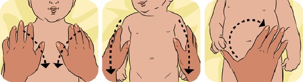 Đối với phần bụng, mẹ sẽ mát-xa theo vòng tròn quanh rốn theo chiều kim đồng hồ. Vùng da bụng của bé rất nhạy cảm, nếu bé giãy đạp không nằm im mẹ không nên cố và chuyển sang động tác ở vùng da khác. Tránh xoa bóp vùng rốn khi bé bị đau hoặc khi cuống rốn chưa lành.