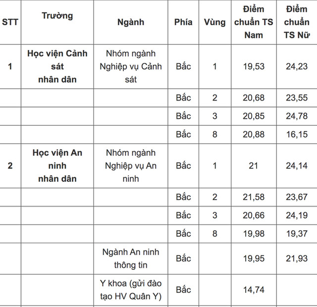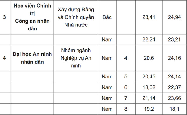 Năm nay là lần thứ hai các trường khối công an tổ chức kỳ thi đánh giá tuyển sinh Công an nhân dân. Với cách tính điểm xét tuyển nói trên, các trường công an không còn điểm chuẩn trên 27. Năm ngoái, mức cao nhất là 26,26, áp dụng với thí sinh nữ phía Bắc, dự thi ngành Xây dựng lực lượng Công an nhân dân (Học viện Chính trị Công an nhân dân). Điểm chuẩn với nhóm thí sinh nam thấp hơn, phổ biến dưới 20.