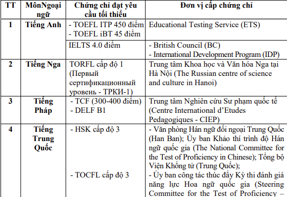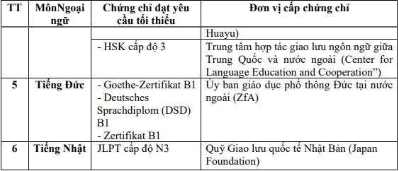 Thí sinh có một trong các chứng chỉ ngoại ngữ (giống hoặc khác với môn Ngoại ngữ đang học tại trường phổ thông) hợp lệ, có giá trị sử dụng ít nhất đến ngày 27/6/ 2023 và đạt mức điểm tối thiểu theo bảng dưới đây: