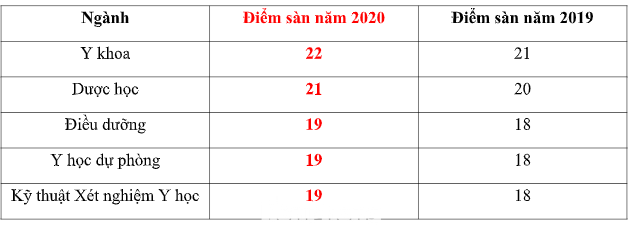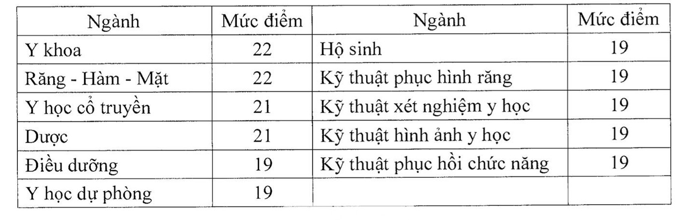 Cụ thể, ngành Y khoa và Răng hàm mặt có điểm sàn cao nhất với 22 điểm, tiếp đó là Y học cổ truyền và Dược học với 21 điểm, các ngành còn lại như Điều dưỡng, Y học dự phòng, hộ sinh, Kỹ thuật phục hồi chức năng… có điểm sàn là 19 điểm.