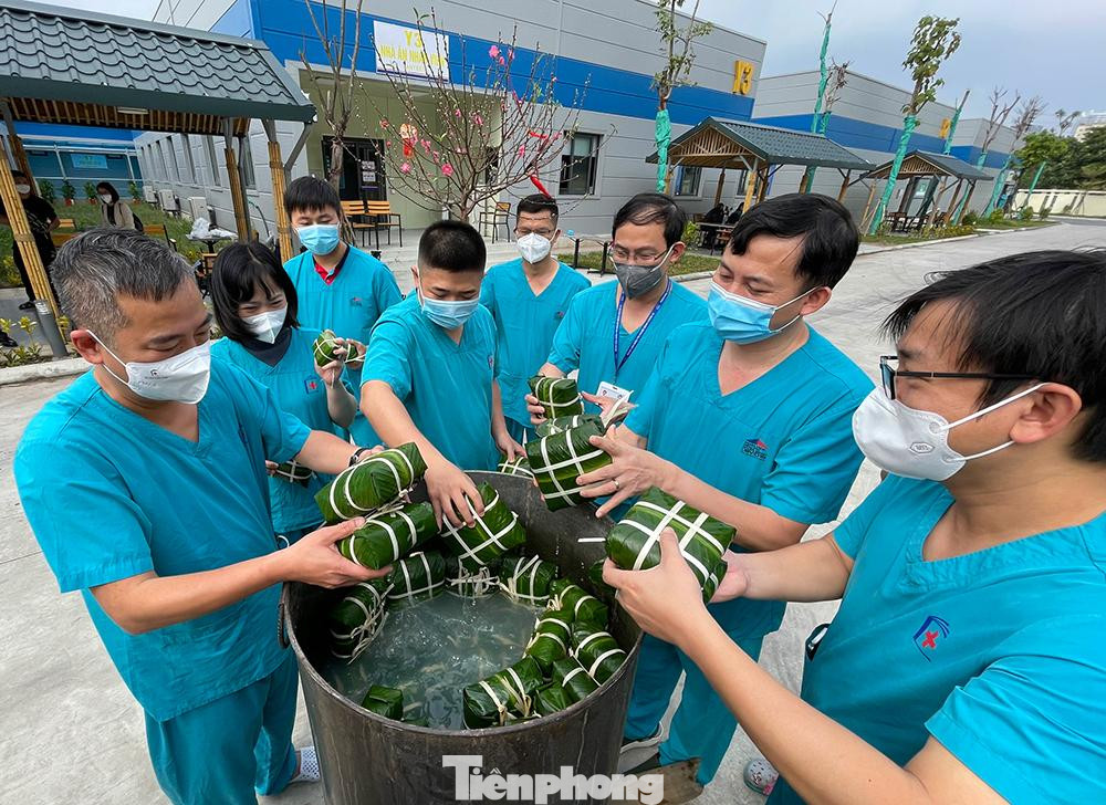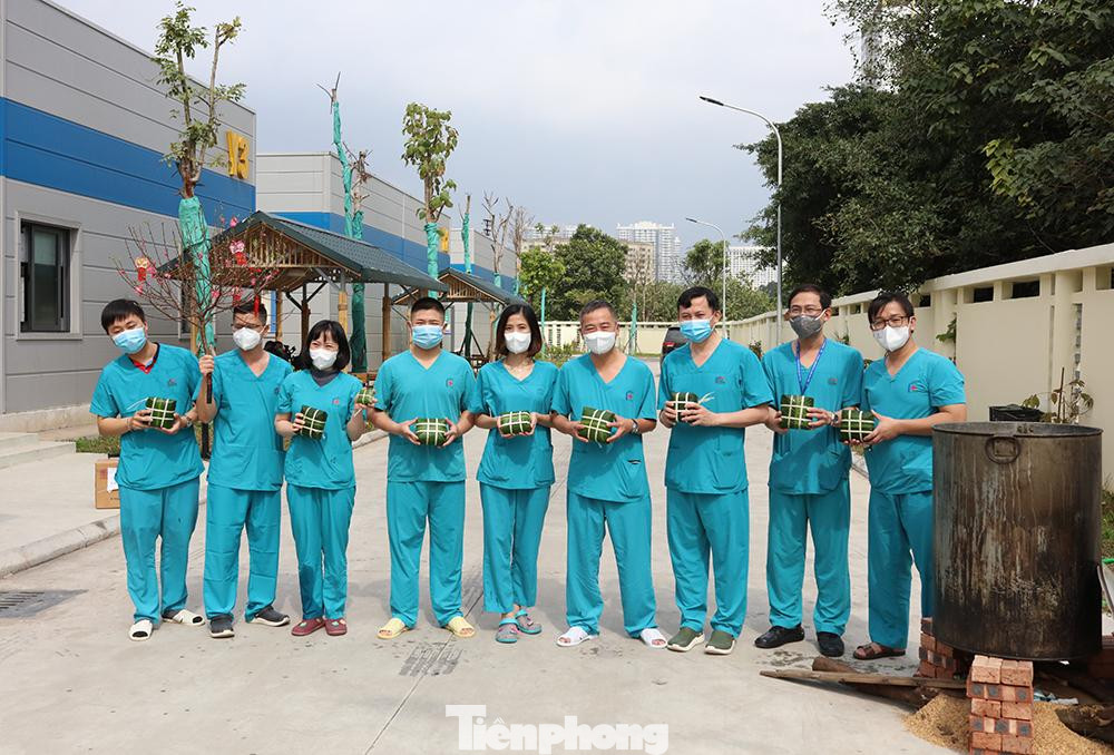 | Bệnh viện có nhiều y bác sĩ, tình nguyện viên từ các tỉnh Thanh Hóa, Hà Giang, Hòa Bình cũng xuống đây từ nhiều tháng để tăng cường và trực Tết.Trong ảnh: Đội ngũ y bác sĩ bên nồi bánh chưng vừa mới gói xong. |
