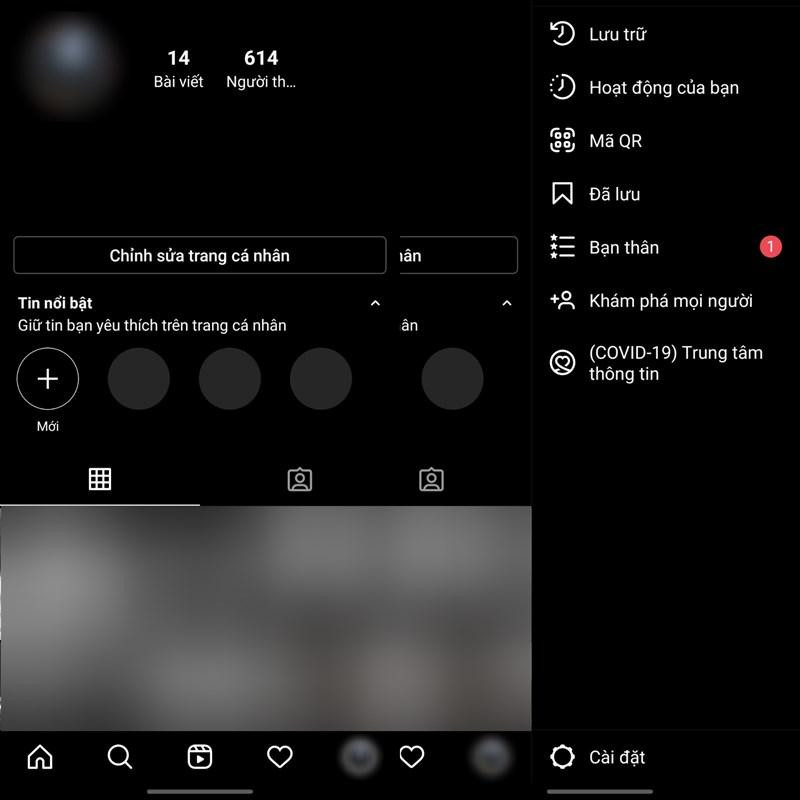 Bước 1: Đầu tiên, bạn mở ứng dụng Instagram trên điện thoại lên và chọn vào mục cá nhân. Sau đó, bạn chọn vào dấu 3 gạch trên góc để mở phần Cài đặt của máy.
