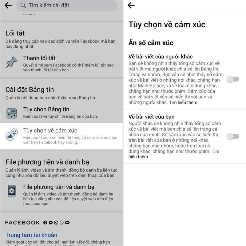 Bước 2: Sau đó, bạn tìm đến mục Tùy chọn về cảm xúc và tắt tính năng đếm lượt thích và lượt xem trên Facebook nhé.