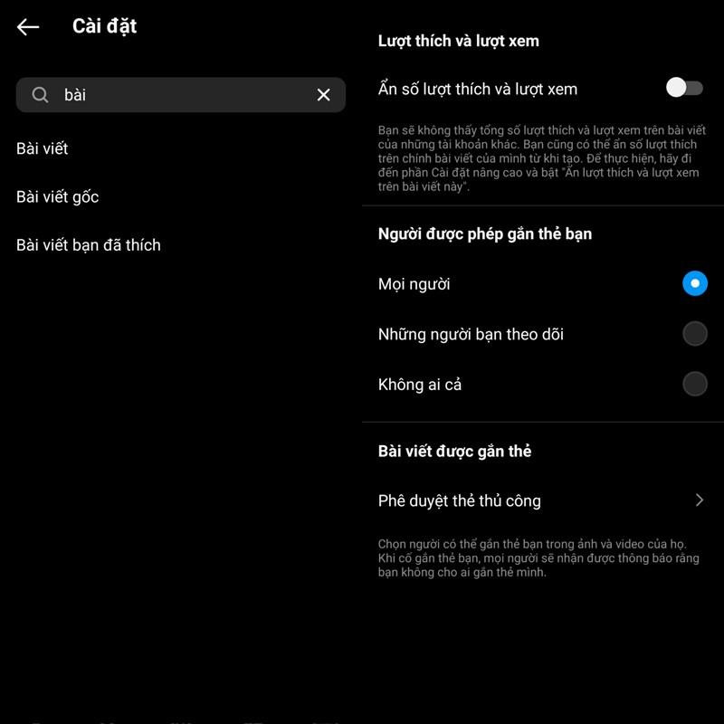 Bước 2: Bạn hãy tìm kiếm và chọn vào Bài viết và Ẩn số lượt thích và xem bài viết nhé.