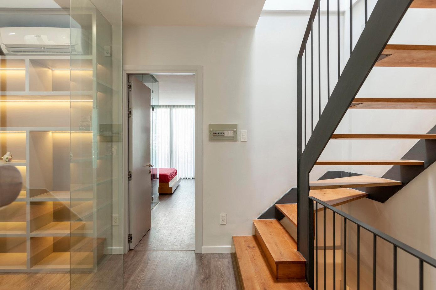 | Phần cầu thang bê tông trung tâm được thay thế bằng cầu thang trọng lượng nhẹ làm bằng khung sắt đặt làm riêng và các bậc thang bằng gỗ dưới một khoảng trống bằng kính. Chiếc cầu thang này giúp cung cấp ánh sáng ban ngày cho nhà bếp và khu vực ăn uống ở phía sau của tầng trệt. |