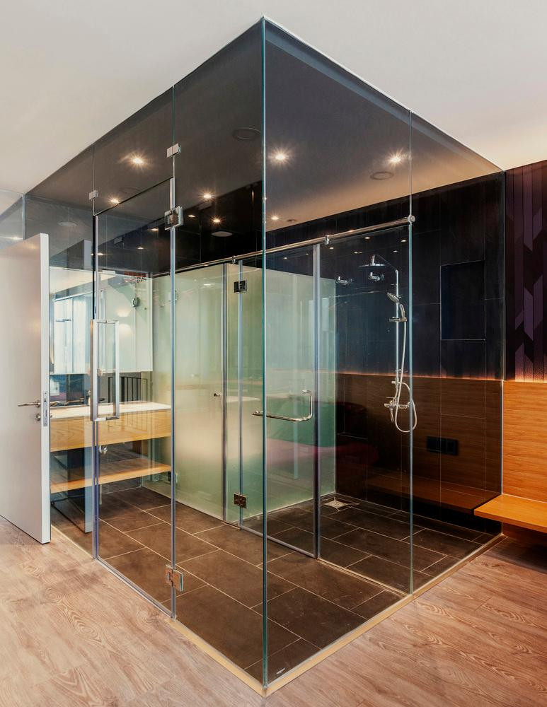 | Phòng ngủ chính và phòng tắm được di dời khỏi khu vực phía trước của tầng hai và được hoàn thiện bằng kính lớn, sàn gỗ nhiều lớp và gạch đen. |