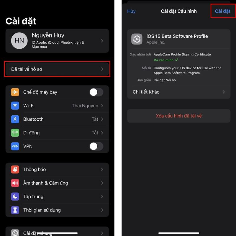 Bước 2: Sau đó, bạn vào Cài đặt > Đã tải về hồ sơ > Cài đặt cấu hình iOS 15 Beta Software Profile.