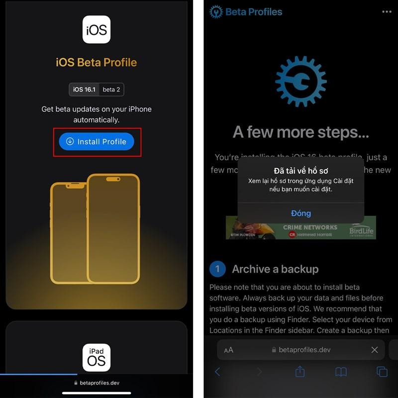 Bước 1: Đầu tiên bạn cần truy cập vào trang Beta Profiles bên dưới, chọn Install Profile iOS 16.1 Beta 2 để tải về máy phiên bản này.