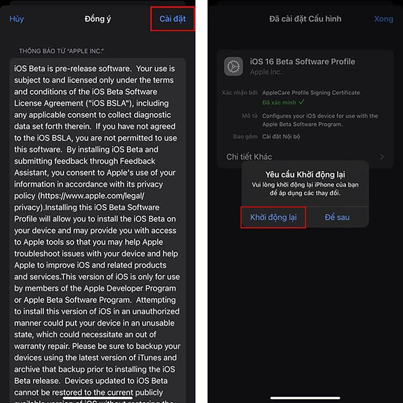 Bước 2: Tiếp đó hãy truy cập vào Cài đặt > Chọn Đã tải về hồ sơ > Cài đặt cấu hình iOS 16 Beta Software Profile để hoàn tất việc cài đặt cấu hình.