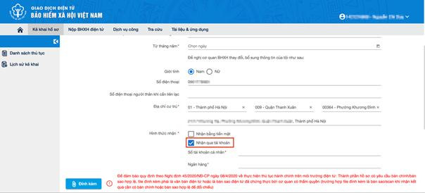 Tại đây, bạn kê khai vào các trường thông tin có sẵn, sau đó lựa chọn nhận qua tài khoản và điền thông tin về số tài khoản nhận chế độ, mã xác nhận rồi chọn “xác nhận”.