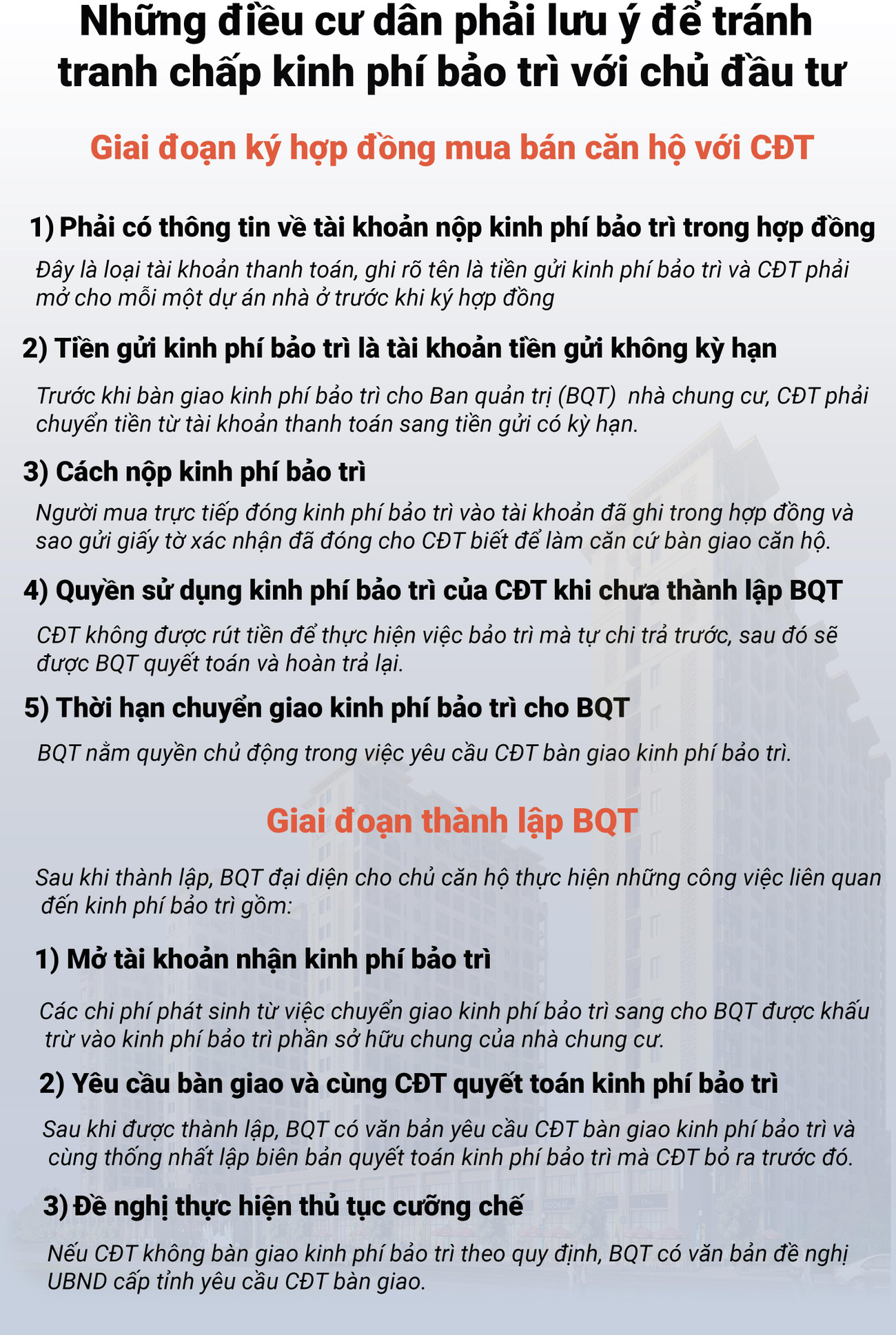 TPO - Để hạn chế tranh chấp về kinh phí bảo trì giữa cư dân và chủ đầu tư (CĐT) nhà chung cư, với quy định pháp luật mới, Cục Cạnh tranh và Bảo vệ người tiêu dùng (Bộ Công thương) khuyến cáo người dân một số điều dưới đây.