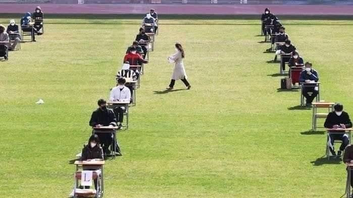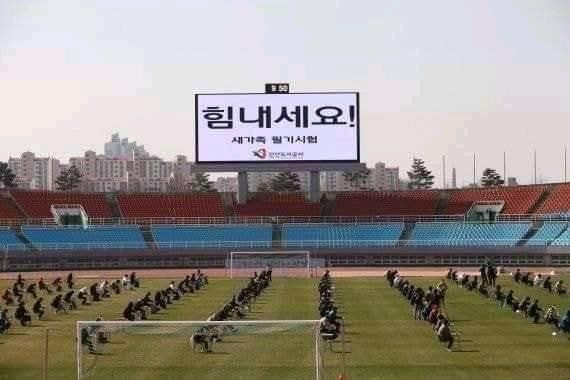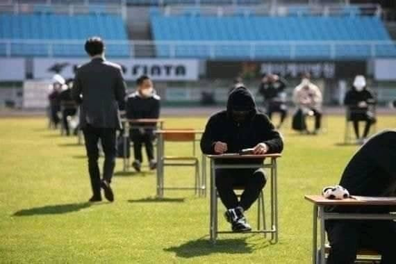 Hàn Quốc đã đem kỳ thi ra tận sân vận động để tổ chức do lo ngại nguy cơ lây lan dịch COVID-19. Cụ thể kỳ thi này đã được diễn ra tại một sân vận động thay vì trong nhà như chúng ta vẫn thường bắt gặp trước đây. Mỗi học viên sẽ ngồi riêng một bàn và khoảng cách của học viên này với học viên khác cũng khá xa.