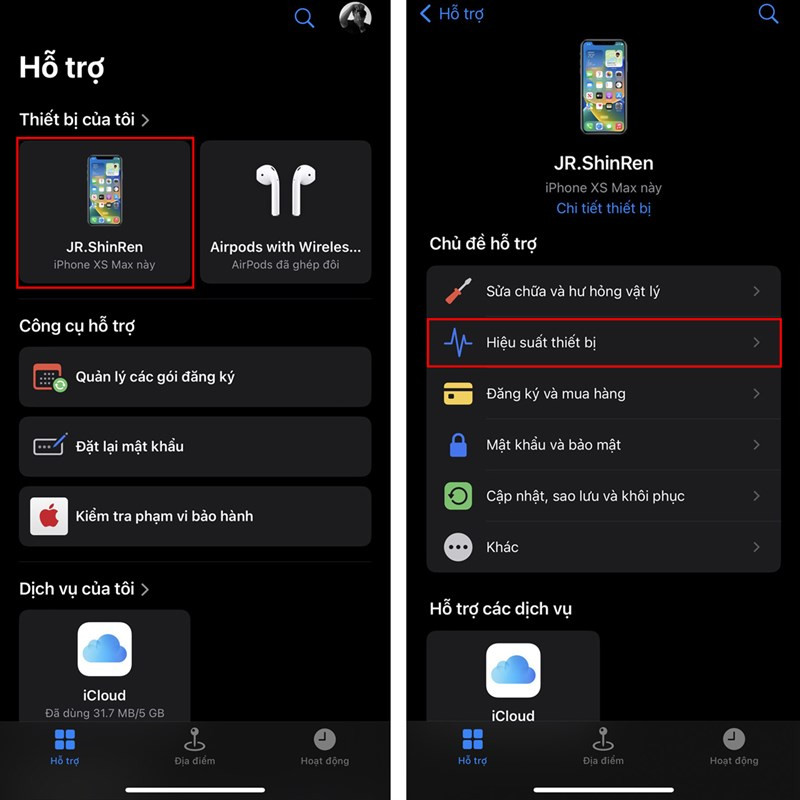 Bước 2: Tiếp theo bạn chọn vào thiết bị iPhone của bạn > Chọn vào mục Hiệu suất thiết bị.