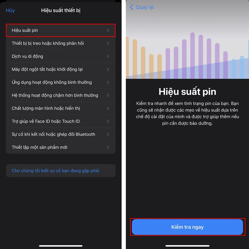 Bước 3: Ngay mục đầu tiên là Hiệu suất pin, bạn chọn vào phần này > Sau đó nhấn vào Kiểm tra ngay.