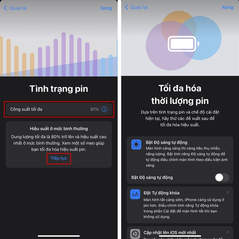 Bước 4: Ngay lập tức bạn sẽ thấy được công suất tối đa của pin trên iPhone (ví dụ pin trên thiết bị này hiển thị 81%, tức là đã bị "chai" khoảng 19%) > Nhấn Tiếp tục để xem được các mẹo giúp tối đa hiệu suất pin.