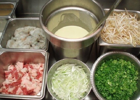 Tôm, thịt thái nhỏ và rửa sạch các loại rau. Bắc chảo lên và cho dầu vào nóng thì cho bột vào để khoảng 3 phút. Kế tiếp cho tôm, thịt và rải giá lên trên để thêm 4 phút. Khi bánh vàng gập bánh lại là xong. Ảnh: Pinterest