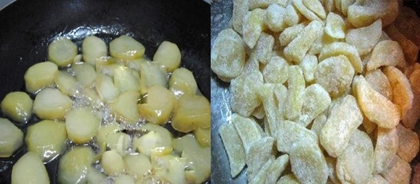 Đảo khoai tây đã ướp đường lên chảo lửa nóng cho đến khi đường trắng kết tinh quanh khoai tây là được.