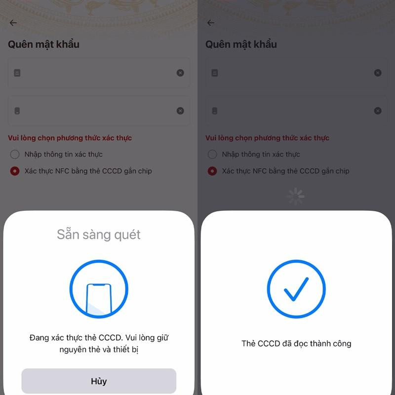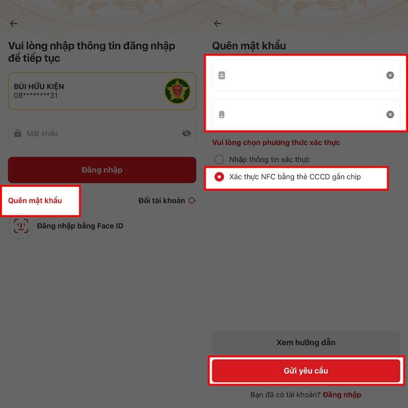 Bước 1: Nếu bạn đã lỡ quên mật khẩu của mình khi đăng nhập thì bạn có thể mở ứng dụng lên, tại nơi đăng nhập sẽ có một nút Quên mật khẩu, hãy ấn vào đó. Tiếp theo, người dùng cần điền đầy đủ các thông tin mà ứng dụng yêu cầu phía bên trên, rồi chọn phương thức xác nhận. Bạn hãy chọn vào phương thức Xác thực NFC bằng thẻ CCCD gắn chip và ấn Gửi yêu cầu.