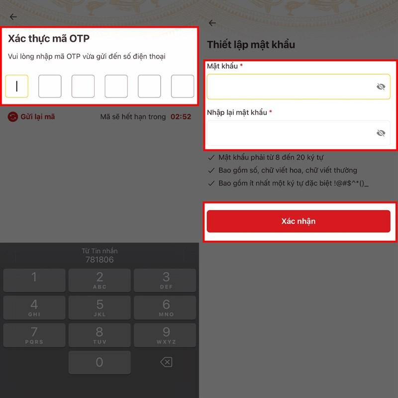 Bước 3: Tiếp theo một mã OTP sẽ được gửi về số điện thoại mà bạn đã nhập ở bước 1, việc bạn cần làm đó là nhập đúng mã OTP vào các ô số bên trên. Sau đó khi đã nhập chính xác thì bạn sẽ được phép cài lại mật khẩu cho tài khoản của mình. Điền mật khẩu mới và nhắc lại mật khẩu rồi ấn Xác nhận là xong.