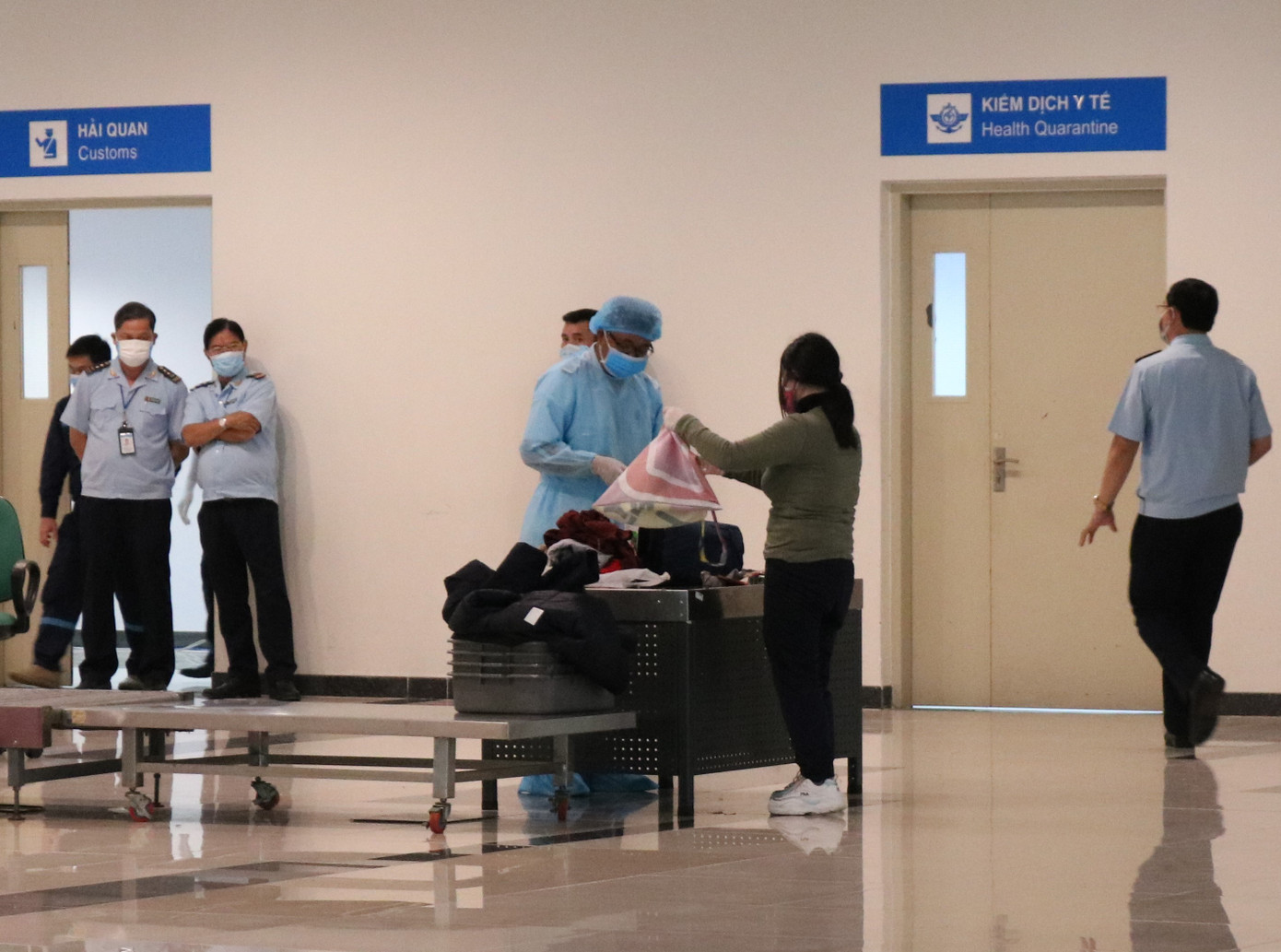 Lực lượng chức năng tại sân bay được mặc đồ bảo hộ an toàn - Ảnh: Kim Hà. Đến khoảng 15 giờ, chuyến bay đầu tiên trong ngày chở theo 121 người, chuyến thứ 2 là 105 người. Tất cả họ đều là người Việt đến Hàn Quốc học tập, lao động, thăm gia đình.