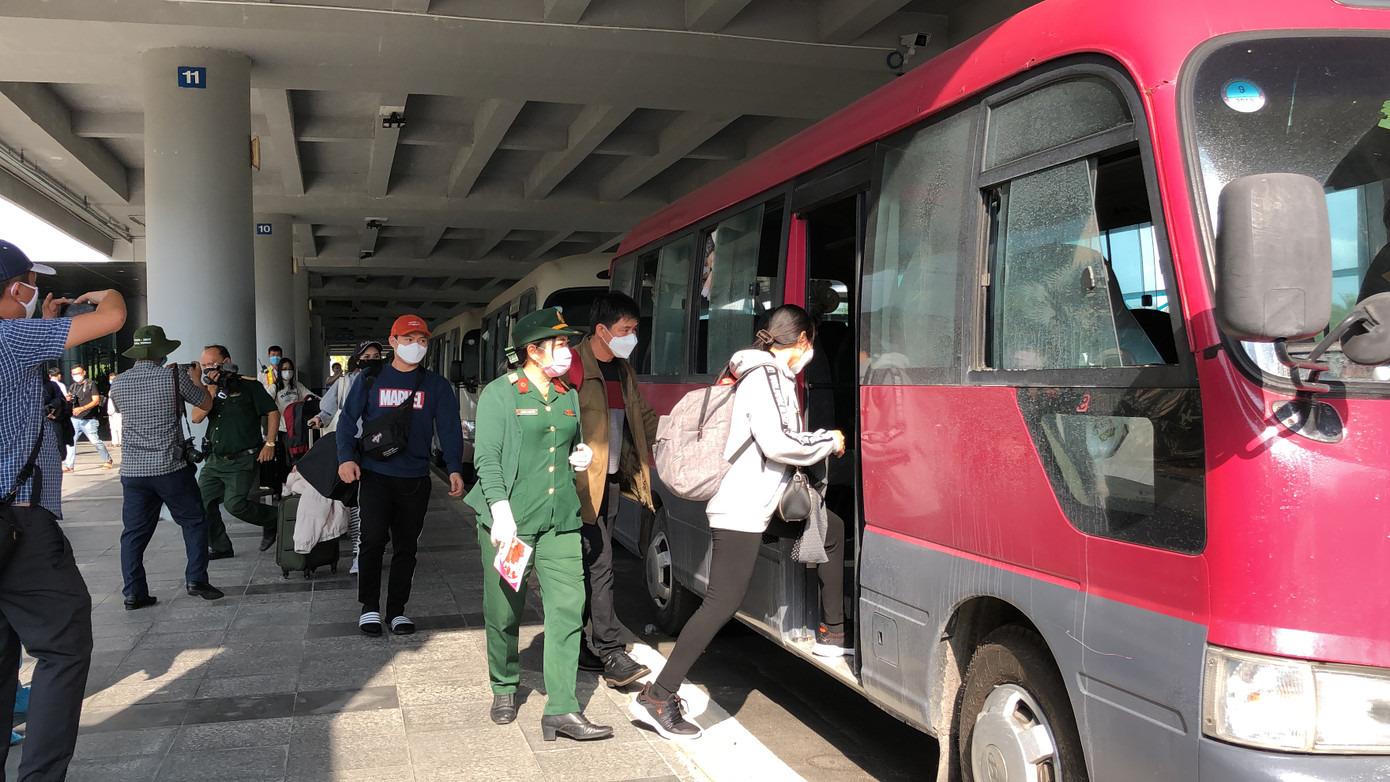Nhân viên tại sân bay phụ giúp hành khách đưa hành lí lên xe - Ảnh: Kim Hà. Sau khi hoàn tất các quy trình kiểm tra sức khỏe, khai báo y tế tại sân bay. Lực lượng chức năng đã hướng dẫn các hành khách di chuyển lên xe chuyên dụng để về khu cách ly.