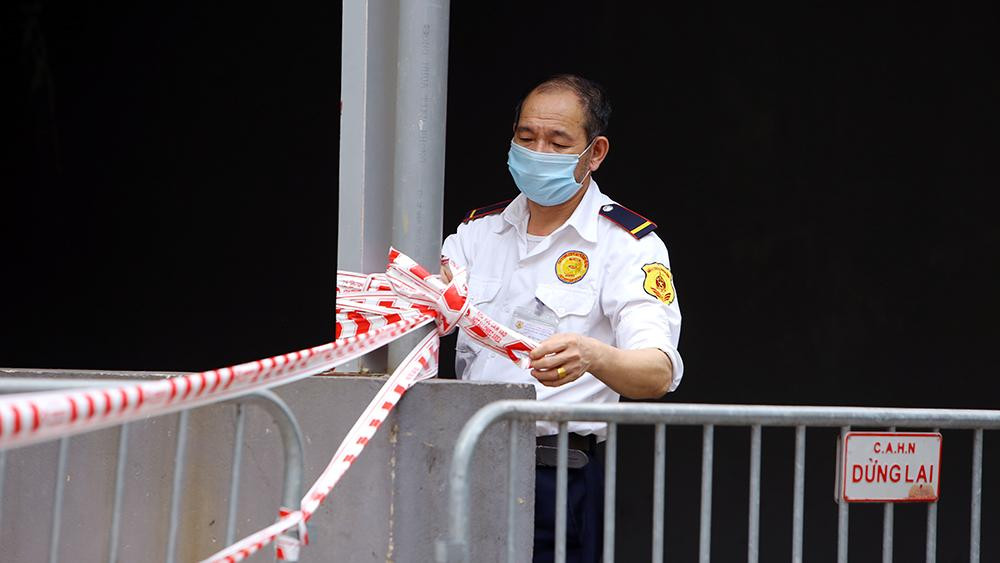 Lực lượng công an, bảo vệ toà nhà yêu cầu những người không có nhiệm vụ tuyệt đối không được lại gần khu vực cách ly.