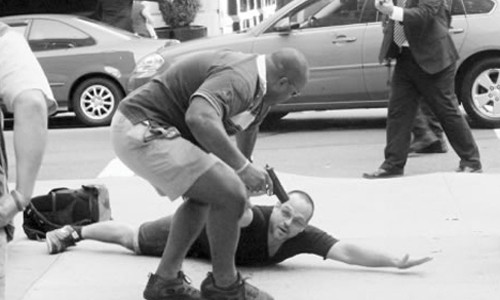Ngay lập tức, hai điều diễn ra gần như đồng thời: một sĩ quan tình báo của sở cảnh sát New York nhảy ra khỏi chiếc xe dẫn đầu đoàn hộ tống và rút khẩu súng lục Glock, trong khi một người đàn ông vạm vỡ mặc áo phông, quần đùi lôi khẩu SIG-Sauer P229 chuyên dụng của mật vụ Mỹ ra và hét lớn "Nằm xuống đất! Nằm xuống". Người đàn ông đô con này là một thành viên đội chống trinh sát của Cơ quan Mật vụ đang cải trang trong đám đông, và anh ta buộc phải làm lộ vỏ bọc của mình để ngăn chặn mối đe dọa tiềm tàng.