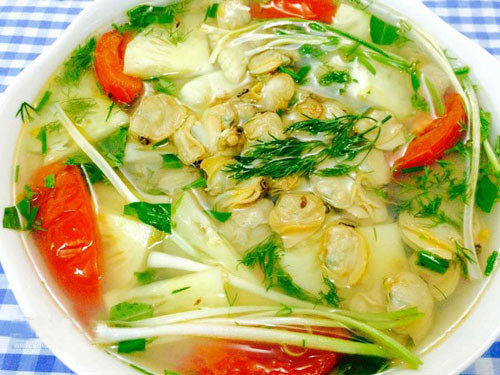 Cho hành, răm, thì là vào rồi tắt bếp. Múc canh ngao ra bát, ăn nóng.