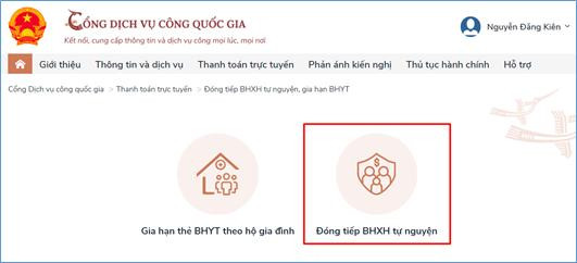 Sau đó người tham gia chọn "Đóng tiếp BHXH tự nguyện".