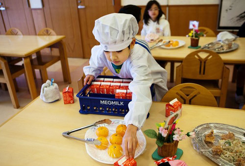 Học sinh Nhật Bản không chỉ đơn thuần đến bữa ngồi vào bàn ăn mà còn phải tham gia chuẩn bị và phục vụ cho bữa trưa – đây là một phần bắt buộc trong chương trình giáo dục. Các em còn được tham quan những trang trại địa phương, học về dinh dưỡng, nấu nướng, cách ứng xử trên bàn ăn và nhiều kĩ năng xã hội khác.