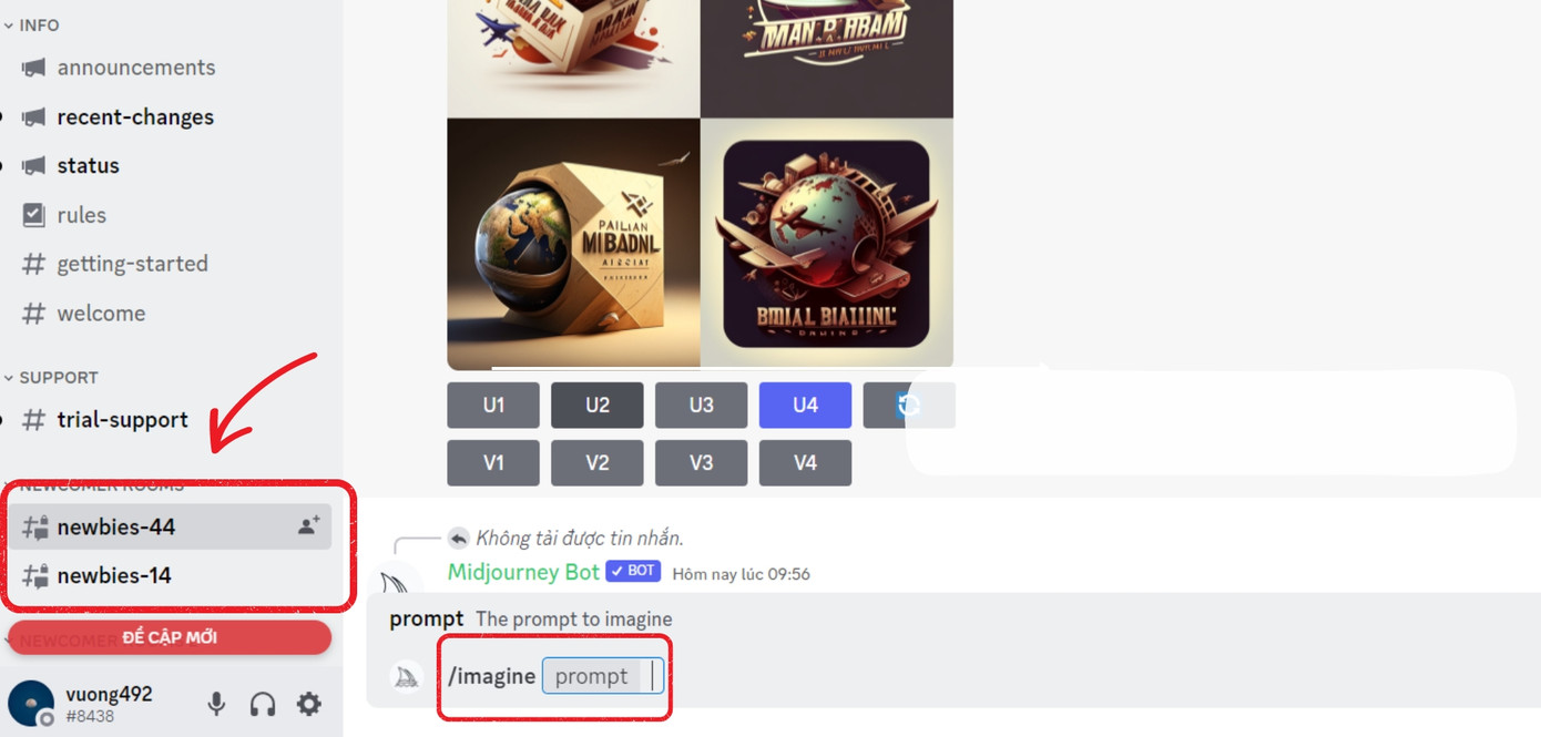Để thực hiện lệnh vẽ, hãy chuyển đến một trong các kênh “Newcomer Rooms” trong menu bên trái. Chúng ta sẽ sử dụng “#newbies-42” nhưng bạn cũng có thể chọn một số phòng khác. Tại đây, bạn nhập ký tự gồm “/imagine” sau đó nhập văn bản miêu tả. Lưu ý, hiện tại AI này chỉ hỗ trợ tiếng anh, để miêu tả chi tiết, rõ ràng, người dùng phải thành thạo tiếng anh hoặc sử dụng các công cụ phiên dịch.