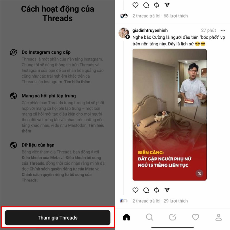 Bước 3: Cuối cùng, bạn sẽ thấy được một thông báo giới thiệu cách hoạt động của ứng dụng này, nhấn Tham gia Threads để bỏ qua nó và bắt đầu sử dụng ứng dụng.